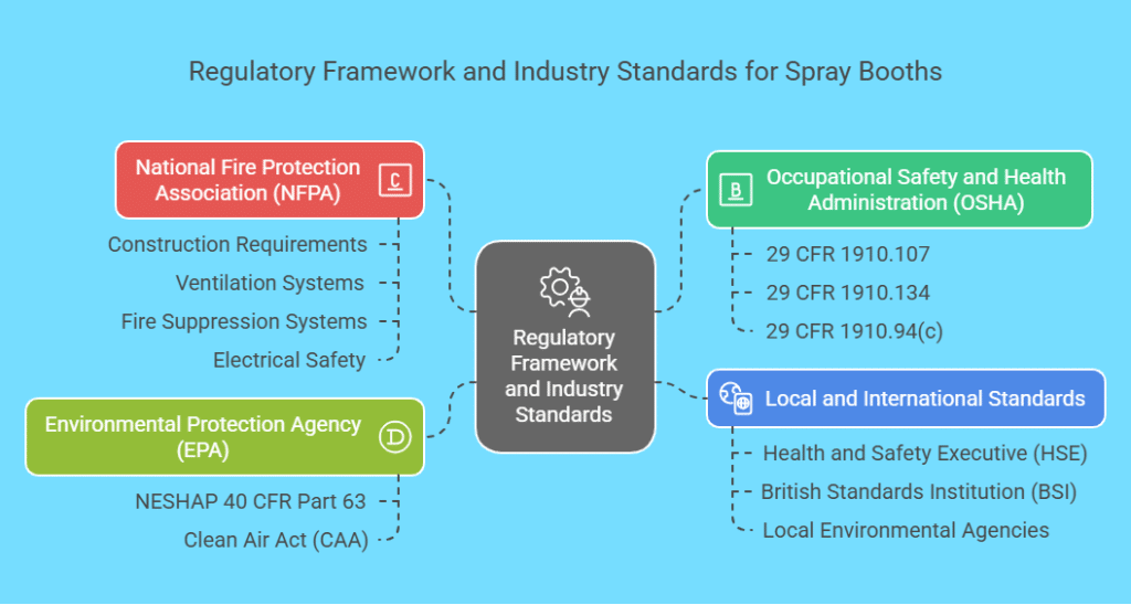 Regulations for spray booths vary by region, and businesses must comply with local laws in addition to international best practices. In the UK, key authorities include: